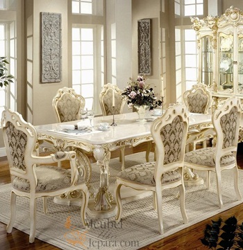 Meja makan kayu klasik merupakan salah satu produk dari Mebel Jepara dengan bahan kayu kualitas tinggi dan warna finishing berkelas mewah. Set Meja makan ini sangat cocok diletakkan di dalam ruang makan mewah rumah anda. Dengan gaya Eropa klasik dan tambahkan 8 kursi makan dengan jok yang sangat lembut. Desainya begitu indah dan khas ukiran jepara menambah kenyamanan sambil makan bersama keluarga di rumah.
